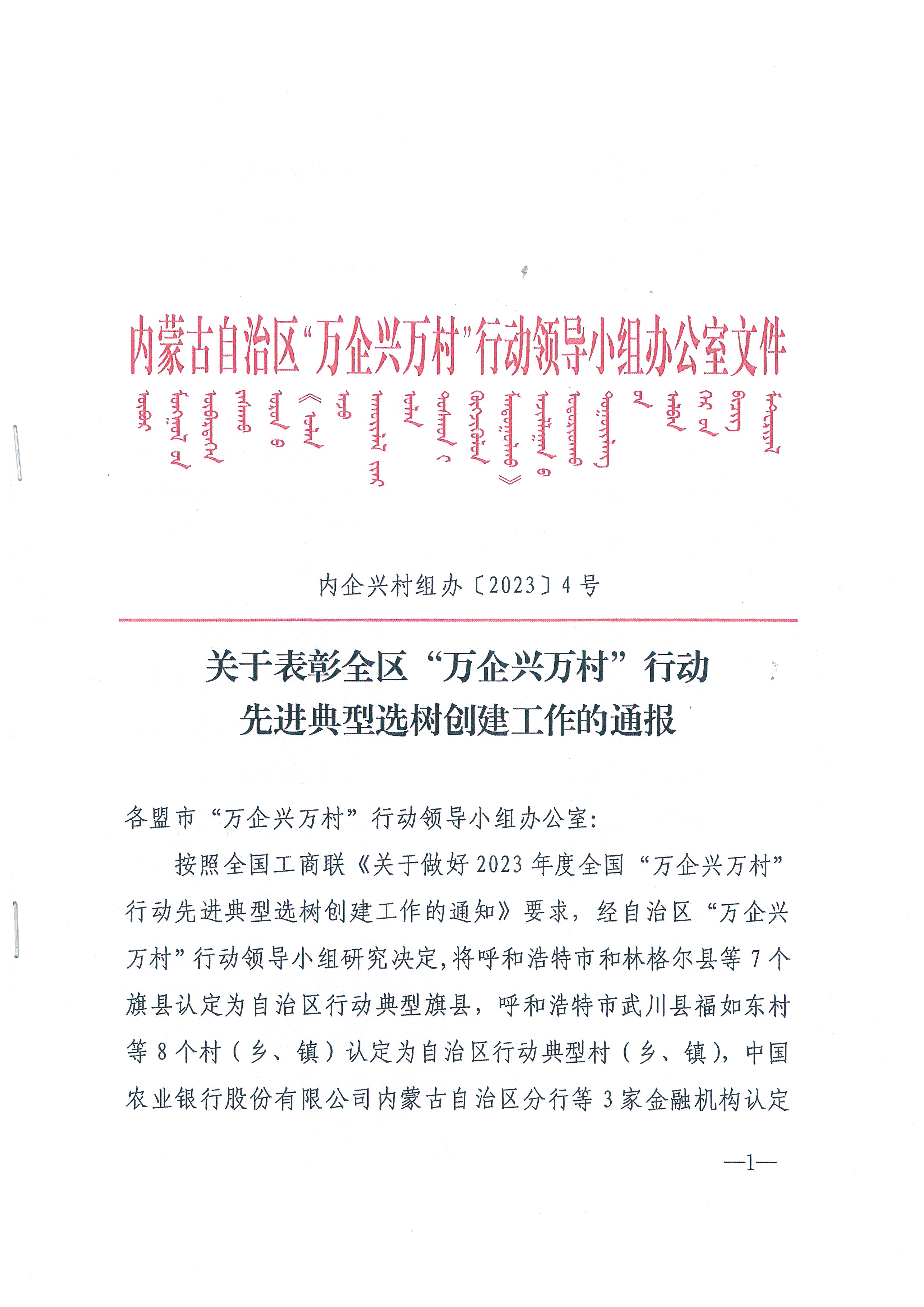 按照全國工商聯(lián)《關(guān)于做好 2023 年度全國“萬企興萬村行動先進典型選樹創(chuàng)建工作的通知》要求,經(jīng)自治區(qū)“萬企興萬村”行動領(lǐng)導(dǎo)小組研究決定,將呼和浩特市和林格爾縣等 7個旗縣認定為自治區(qū)行動典型旗縣,呼和浩特市武川縣福如東村等8個村(鄉(xiāng)、鎮(zhèn))認定為自治區(qū)行動典型村 (鄉(xiāng)、鎮(zhèn)),中國農(nóng)業(yè)銀行股份有限公司內(nèi)蒙古自治區(qū)分行等 3 家金融機構(gòu)認定為自治區(qū)行動典型金融機構(gòu),內(nèi)蒙古農(nóng)牧業(yè)產(chǎn)業(yè)化龍頭企業(yè)協(xié)會等 3 家商會認定為自治區(qū)行動典型商會,鄂爾多斯光彩事業(yè)基金會 1家基金會認定為自治區(qū)行動典型基金會,內(nèi)蒙古蒙清農(nóng)業(yè)科技開發(fā)有限責(zé)任公司等 19 個項目(企業(yè))認定為自治區(qū)行動典型項目(企業(yè))
