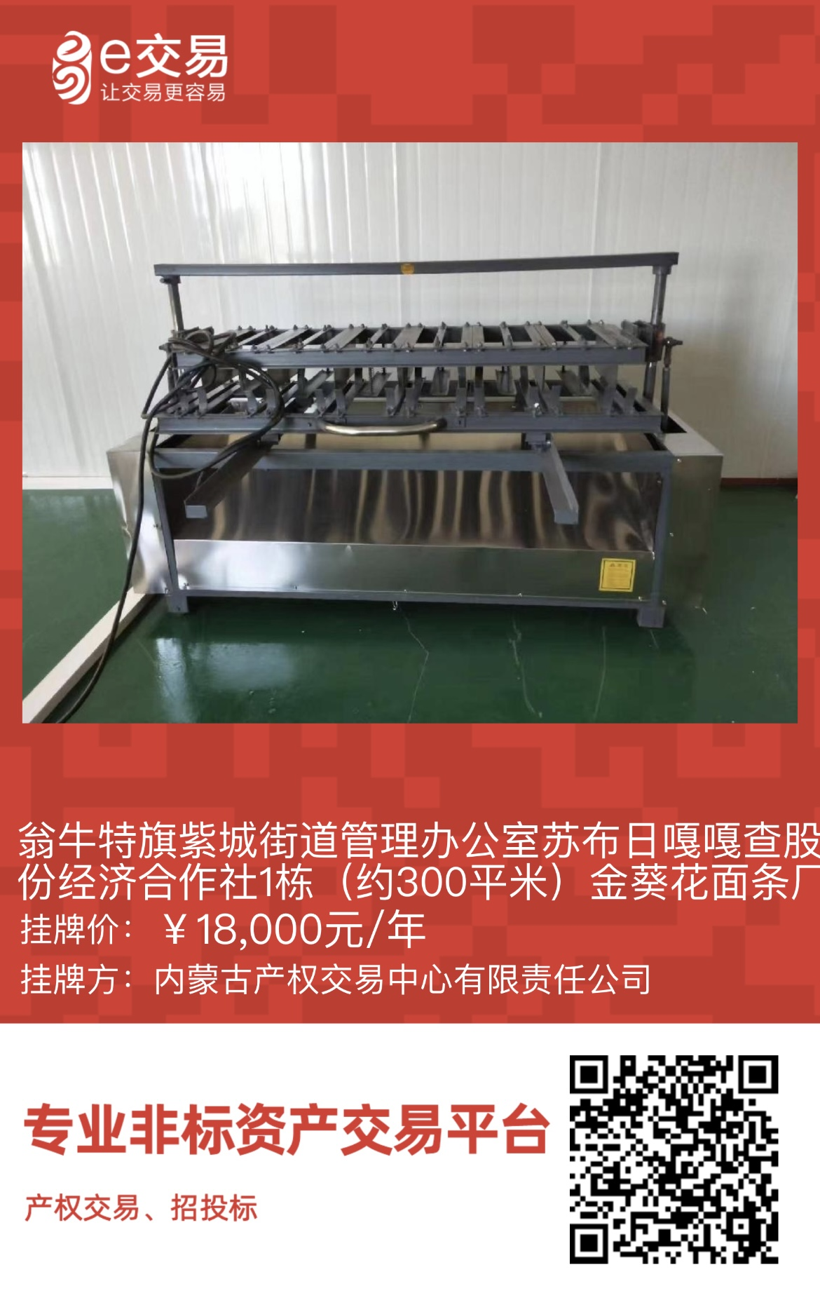 翁牛特旗紫城街道管理辦公室蘇布日嘎嘎查股份經(jīng)濟合作社1棟(約300平米)金葵花面條廠廠房及設備出租(租金18000元/年,租期5年)