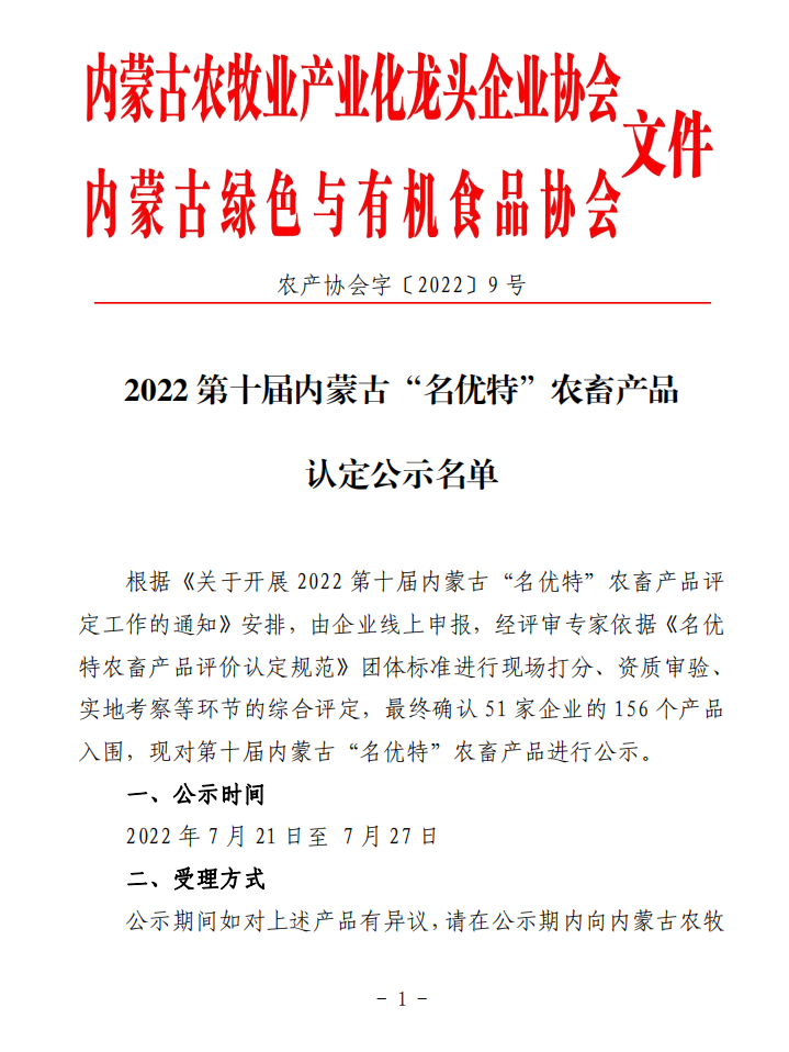 2022第十屆內蒙古“名優(yōu)特”農畜產品名單公告