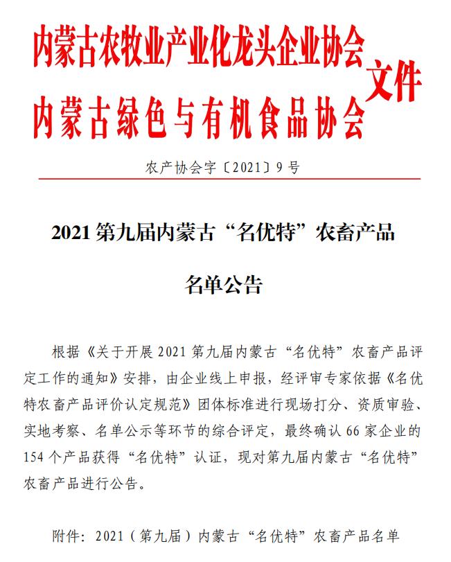 2021第九屆內(nèi)蒙古“名優(yōu)特”農(nóng)畜產(chǎn)品名單公告